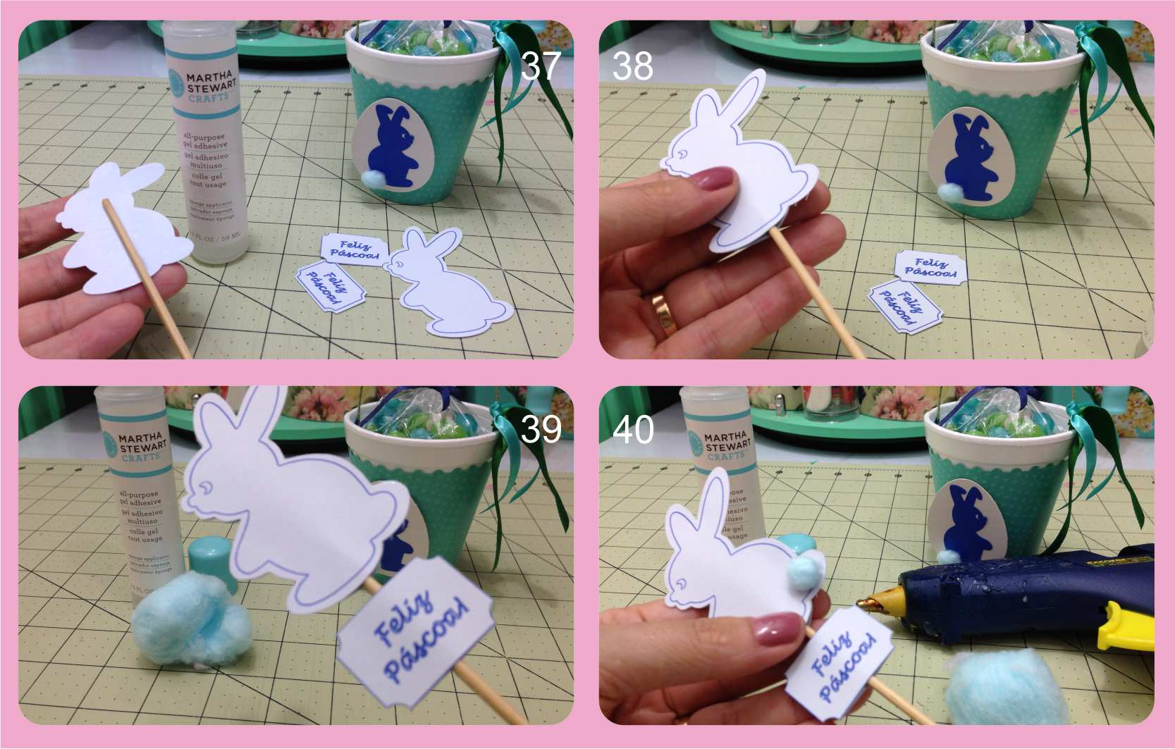 - 37 – Os coelhinhos foram colados sobre um palito de churrasco.
