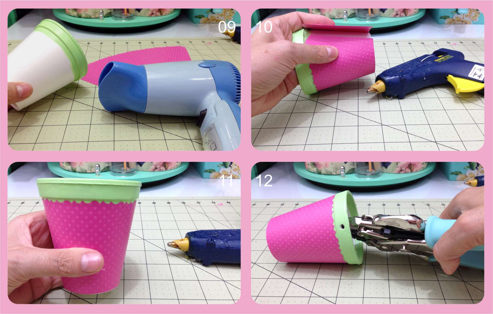 - 25- Os laços foram sobrepostos e colados no copo com cola quente.