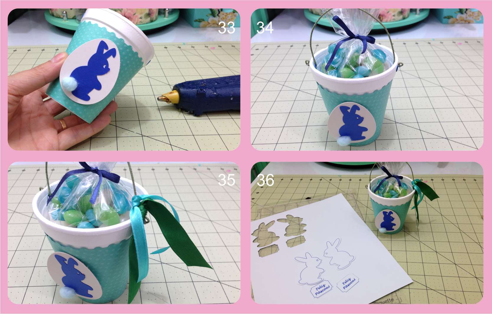 - 26 – Para incrementar a temática de páscoa eu imprimi e cortei na silhouette dois ovinhos de papel. Se você for fazer para uma festinha de aniversário por exemplo você poderia colocar o nome da criança, a fotinho dela, etc.