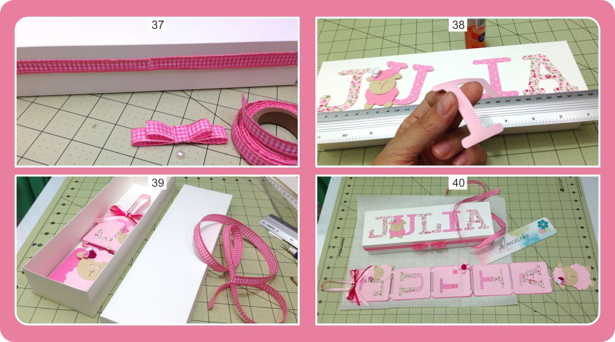 - 37 – Caprichar no acabamento faz toda diferença! Contornei a caixa com esta fita xadrez vichy, fiz também um laço e ao meio colei uma meia pérola que deu o charme final. E com tantos rabicós e grampinhos que uma menina tem na sua infância, a mamãe Cris já vai ganhar um ótimo lugar para guardar não é mesmo.