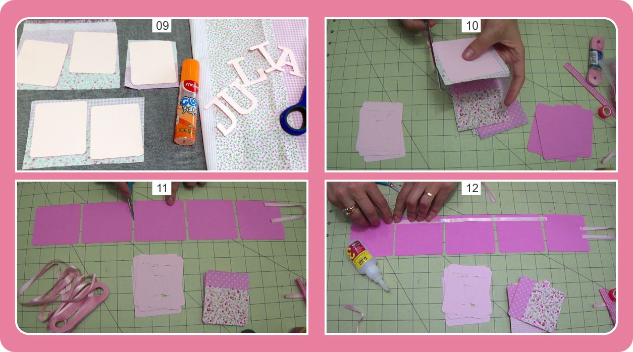 - 12 – Alinhe bem a fita de cetim nas lateras e vá colando em alguns pontos de cada plaquinha. OBS: Se a fita de cetim for face única cuide para o lado brilho ficar voltado para baixo.