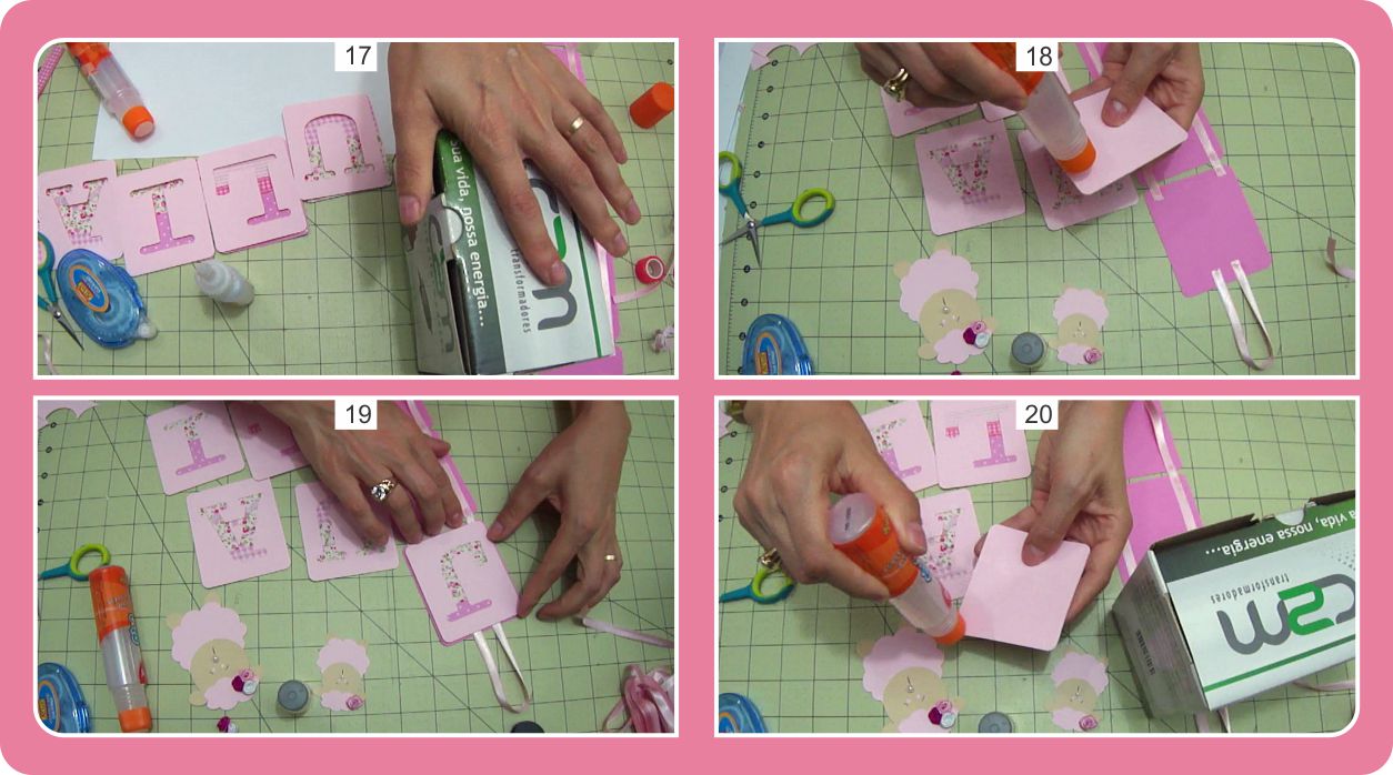 - 18 – Depois de seca as plaquinhas é hora de colar sobre a base com as fitas de cetim, use a mesma cola gel.