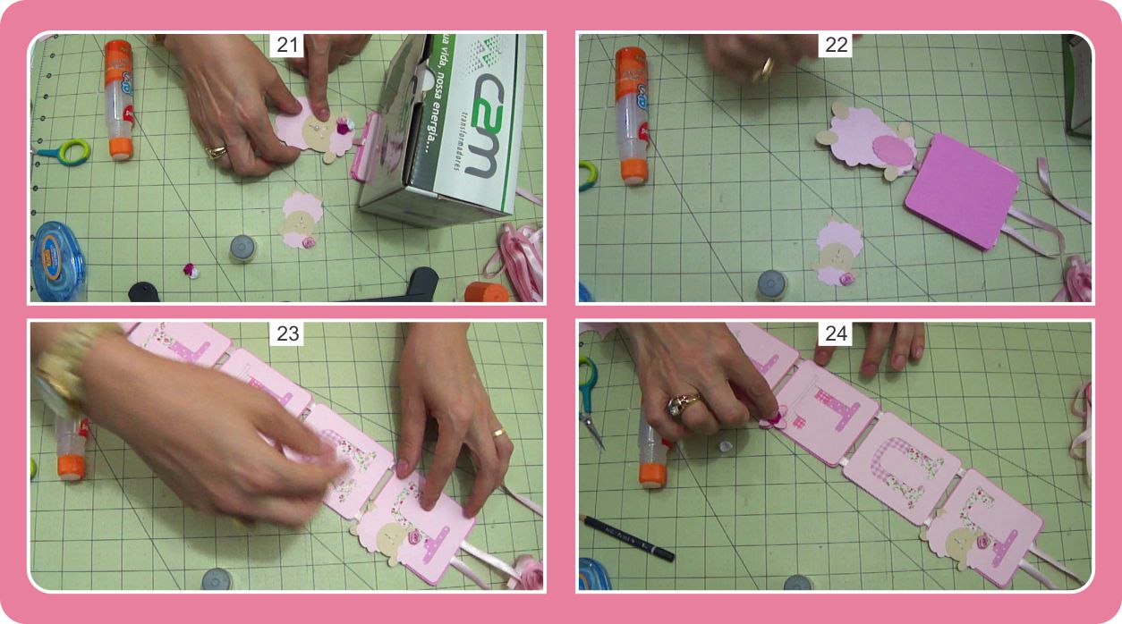 - 22- O acabamento limpo e bem acabado é tudo numa peça artesanal, então esconda o final da fita de cetim com algum recorte de papel.