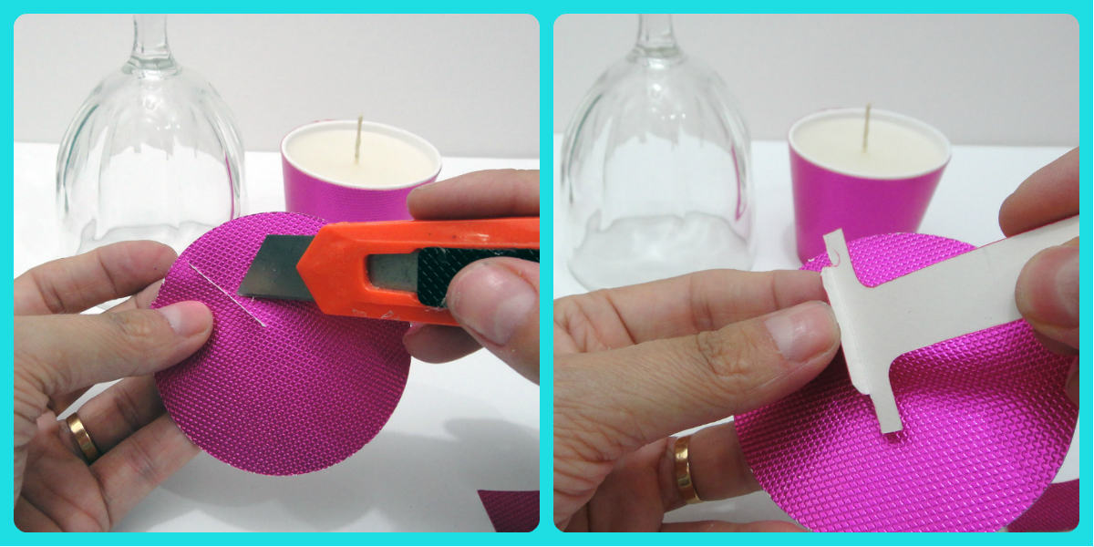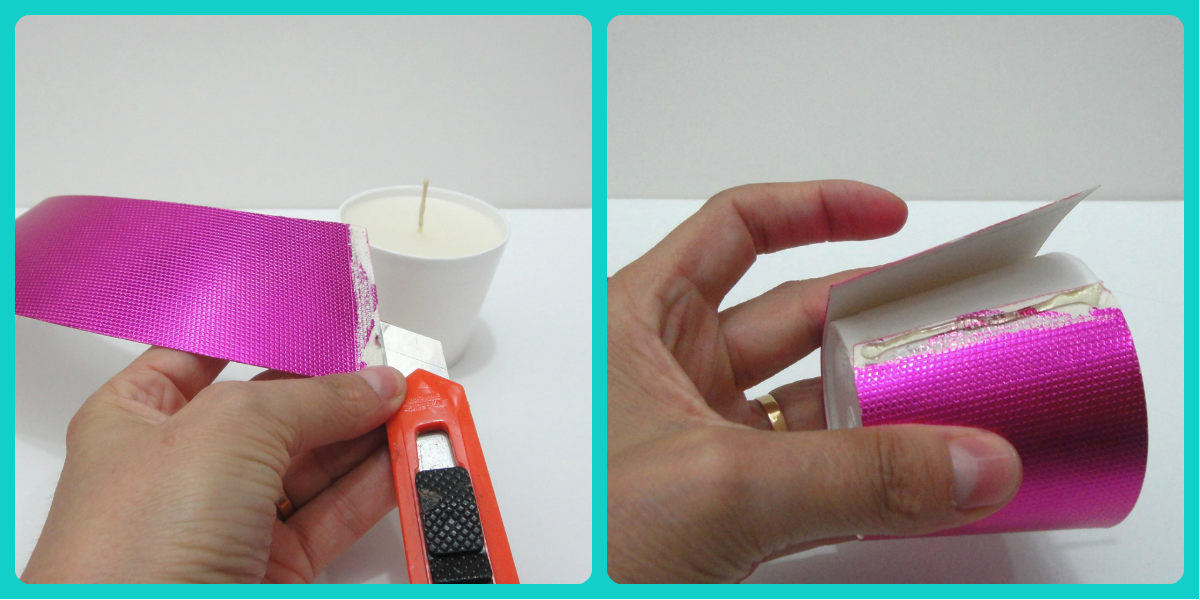 Utilizei papel metalizado na cor rosa pink. Para ver como obter o molde do copo, acompanhe no youtube o projeto Vela em Xícara de papel.