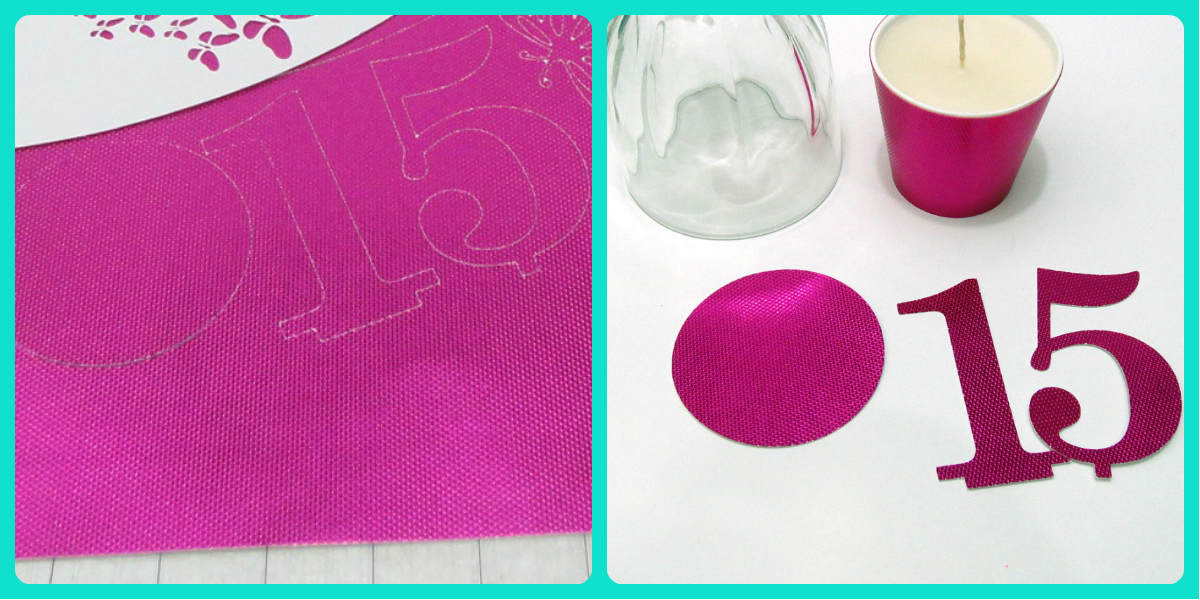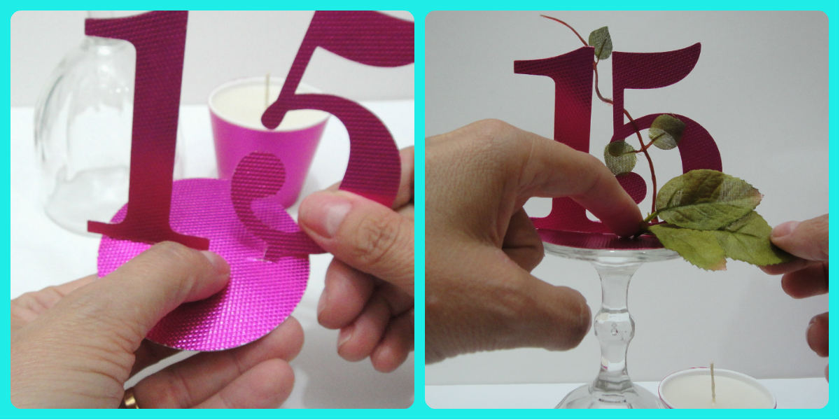 Próximo passo é cortar um círculo numa medida maior que o pé da taça e o número 15. Eu cortei com a minha plotter silhouette mas você pode riscar/desenhar o número como mostrarei abaixo desta foto.
