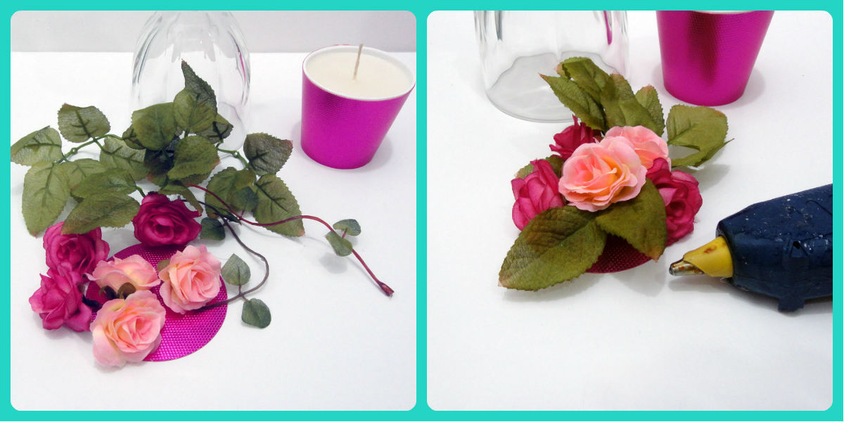 Faça um outro círculo menor que o copo, cole as flores permanente nele. Este você colocará dentro do copo.