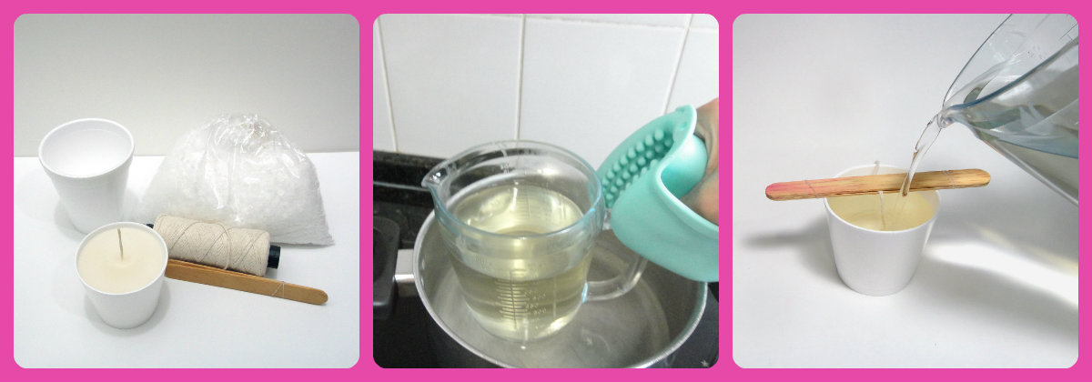 Vamos inicar pela vela. Para fazê-la você vai precisar de parafina, pavio e copo ou pote. Neste projeto eu utilizei copo térmico de isopor.