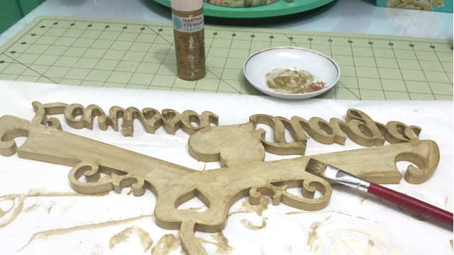 Após apliquei duas demãos de tinta acrílica dourada da marca Martha Stewart.