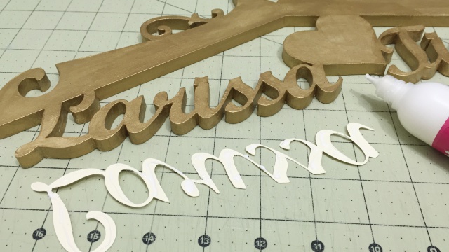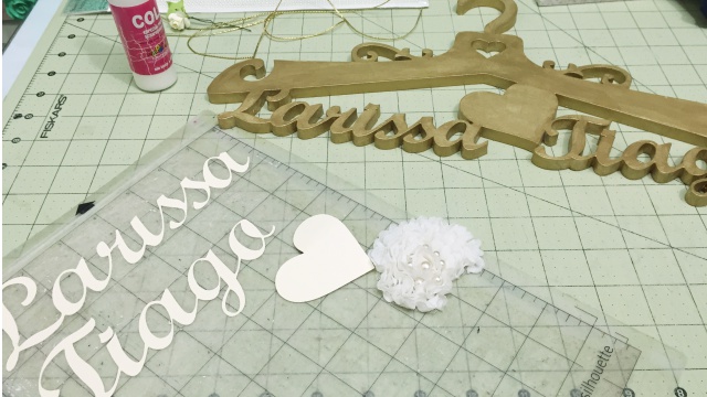 Vou logo lhe explicando…a Miriam proprietária da empresa que cortou o cabide carinhosamente me forneceu o arquivo com a arte em corel draw. Retirei a parte que não me interessava deixando só os nomes para então cortar no papel cardstock cor marfim com a plotter silhouette.